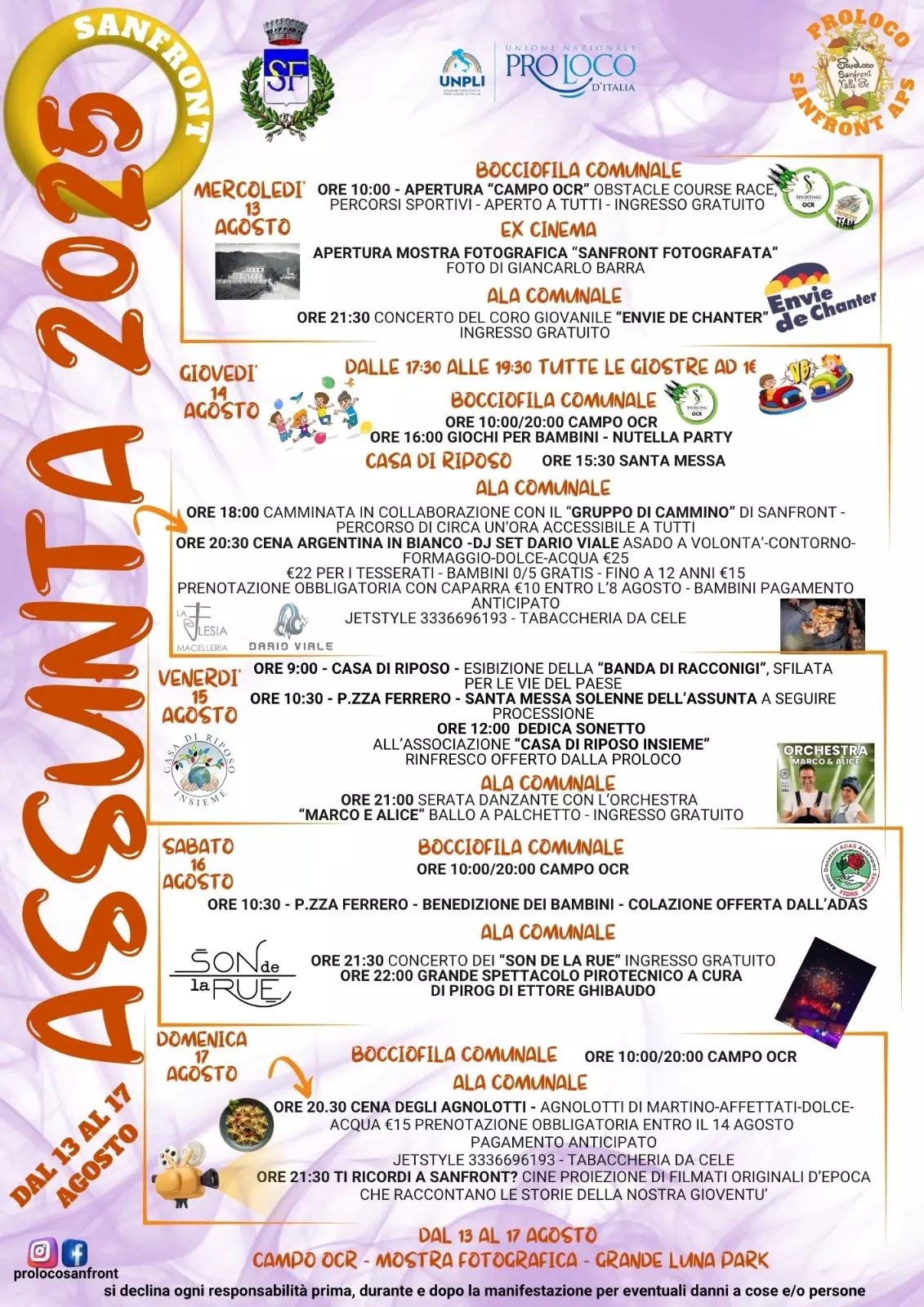 Tutto è pronto in paese per dare il via ai numerosi appuntamenti dell’Agosto Sanfrontese, che animeranno il periodo estivo per i residenti, per i turisti e per quanti vorranno trascorrere qualche momento di festa in buona compagnia. Come sempre si comincia con la festa patronale di Robella, proseguendo poi con la festa patronale del Serro, quindi la festa patronale dell’Assunta a Sanfront. Senza dimenticare le altre funzioni agostane nelle cappelle. L’organizzazione fa capo ai comitati frazionali, alla Pro Loco e a tutti i volontari che collaborano alla buona riuscita degli eventi.