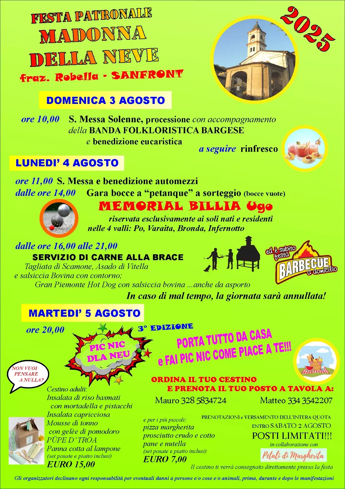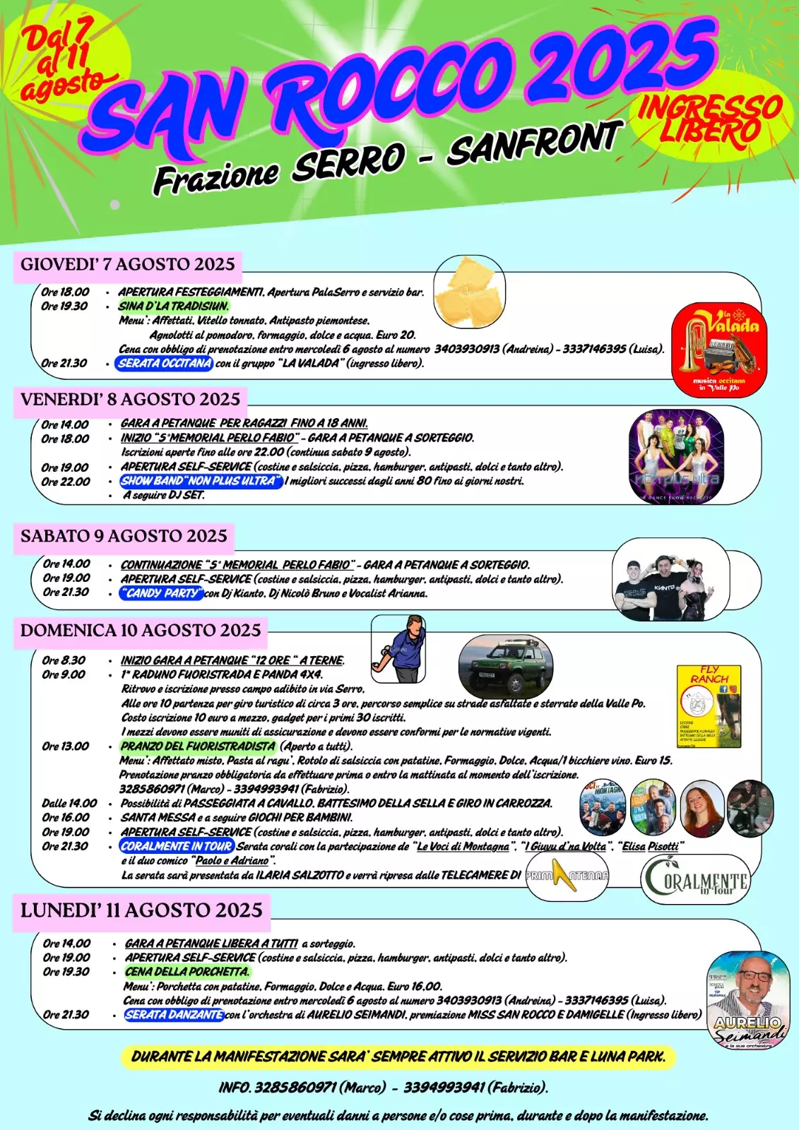 Tutto è pronto in paese per dare il via ai numerosi appuntamenti dell’Agosto Sanfrontese, che animeranno il periodo estivo per i residenti, per i turisti e per quanti vorranno trascorrere qualche momento di festa in buona compagnia. Come sempre si comincia con la festa patronale di Robella, proseguendo poi con la festa patronale del Serro, quindi la festa patronale dell’Assunta a Sanfront. Senza dimenticare le altre funzioni agostane nelle cappelle. L’organizzazione fa capo ai comitati frazionali, alla Pro Loco e a tutti i volontari che collaborano alla buona riuscita degli eventi.