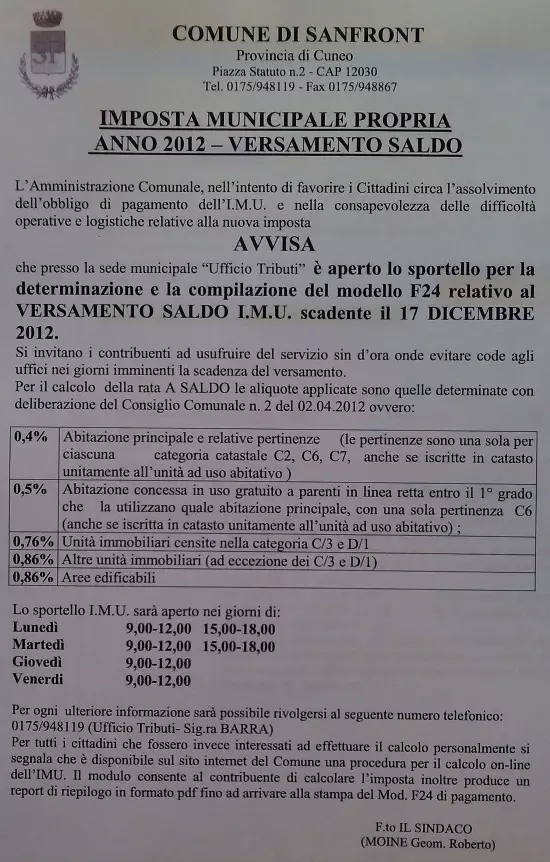 Si ricorda infine che, su questo sito internet del Comune di Sanfront, è possibile effettuare personalmente il calcolo on-line dell’Imu.