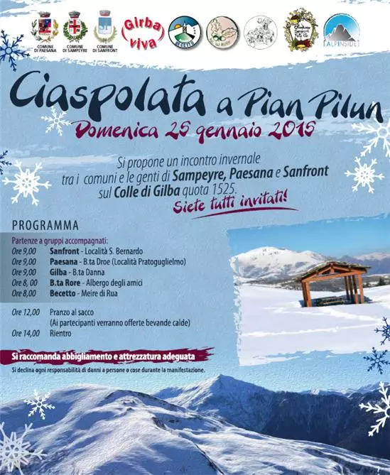 "L' iniziativa è di un gruppo di amici di Sanfront e Sampeyre, cui si sono uniti anche altri di Paesana, i quali, dopo il successo della manifestazione estiva a Pian Pilun, propongono ora questa ciaspolata invernale nel punto crocevia tra Sampeyre, Paesana e Sanfront" sottolinea uno dei promotori della giornata, il consigliere comunale di Sanfront Danilo Belviso.