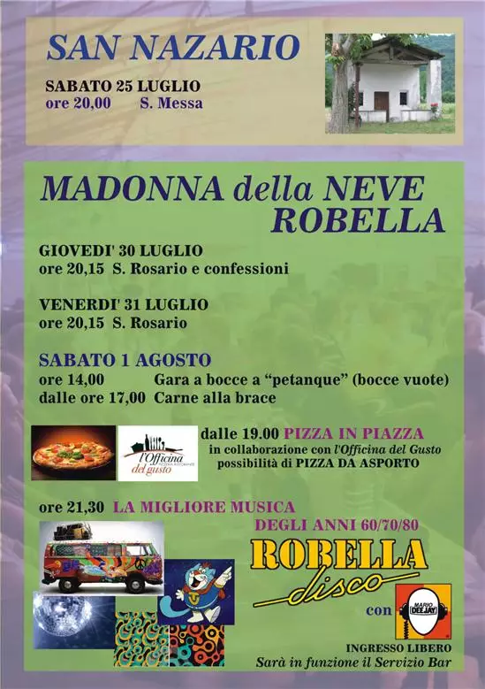 Si svolgerà tra Sabato 01 agosto e Martedì 04 agosto presso la frazione Robella di Sanfront la tradizionale festa patronale dedicata alla “Madonna della Neve”, sentito momento di aggregazione della comunità residente, capace di attirare anche l’interesse e la curiosità della gente di paesi vicini e non.