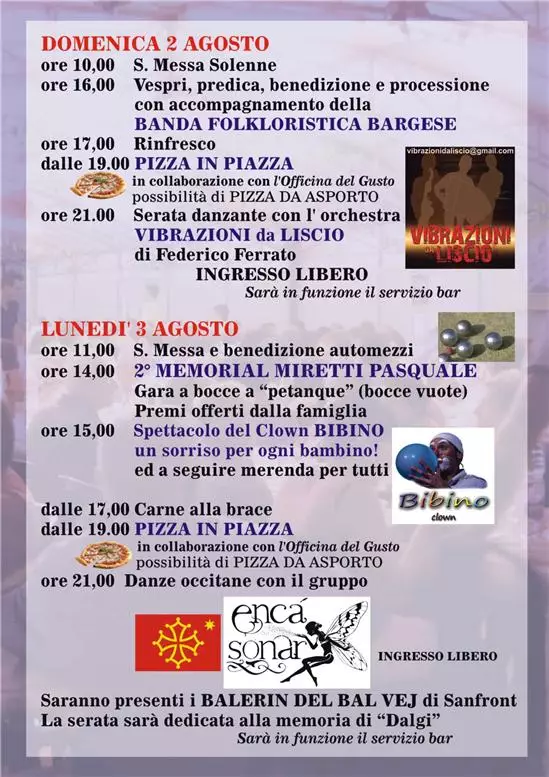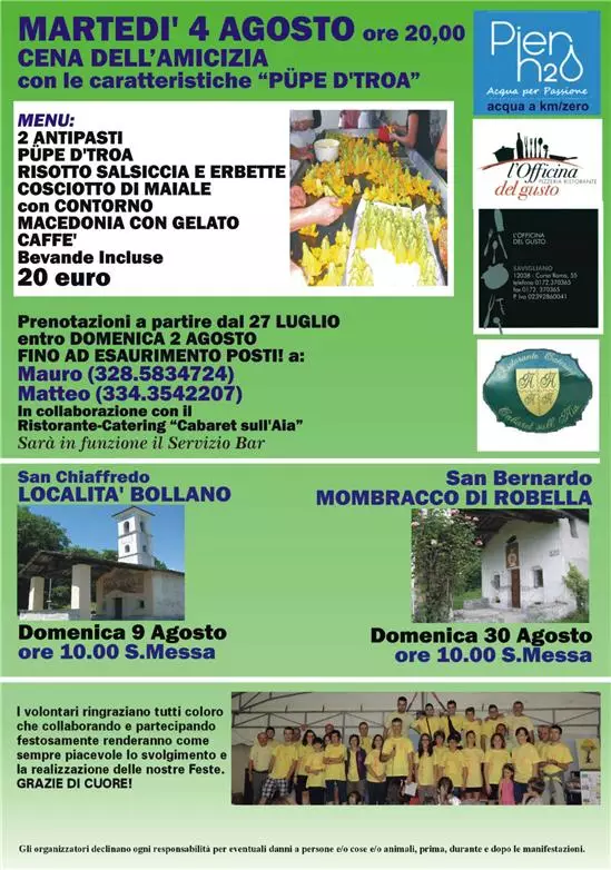 Promossa dal locale gruppo festeggiamenti che da svariati anni si occupa della sua organizzazione, la manifestazione, riprendendo le tradizionali gare alle bocce accompagnate dalla carne alla brace e riproponendo la ormai classica “Cena dell’Amicizia” accompagnata dalle “Pupe d’troa” (fiori di zucca ripieni), presenterà quest’anno alcune curiose novità rispetto agli anni passati; in particolare la serata “Disco” anni 60/70/80 e la “Pizza in piazza”.