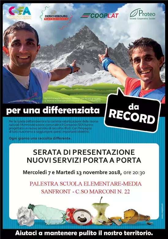 Preparativi anche a Sanfront per il prossimo avvio del servizio di raccolta rifiuti "porta a porta". Mercoledì 7 novembre, alle ore 20.30 presso la Palestra della Scuola Elementare-Media in C.so Marconi n. 22, si terrà un primo incontro informativo sul tema della raccolta con il nuovo sistema. Martedì 13 novembre, sempre alle 20.30 nello stesso locale, secondo incontro. Tutta la popolazione è invitata a partecipare. Nel corso delle serate si potranno anche rivolgere domande e richieste di chiarimento ai tecnici e funzionari che organizzano il servizio "porta a porta". Verranno inoltre forniti gli appositi kit di raccolta.