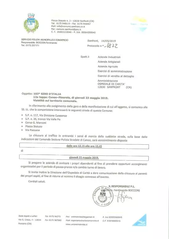 In riferimento allo svolgimento della gara e della manifestazione di cui all'oggetto, si comunica che la competizione interesserà le seguenti strade di questo Comune :-