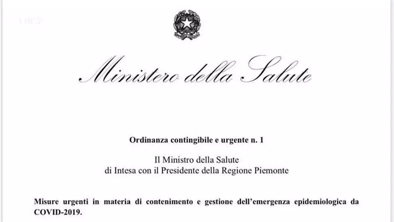 Il Ministro della Salute di intesa con il Presidente della Regione Piemonte emana le misure urgenti in materia di contenimento e gestione dell'emergenza epidemiologica da Covid-2019 con Ordinanza Contingibile e urgente n. 1 del 23 febbraio 2020.