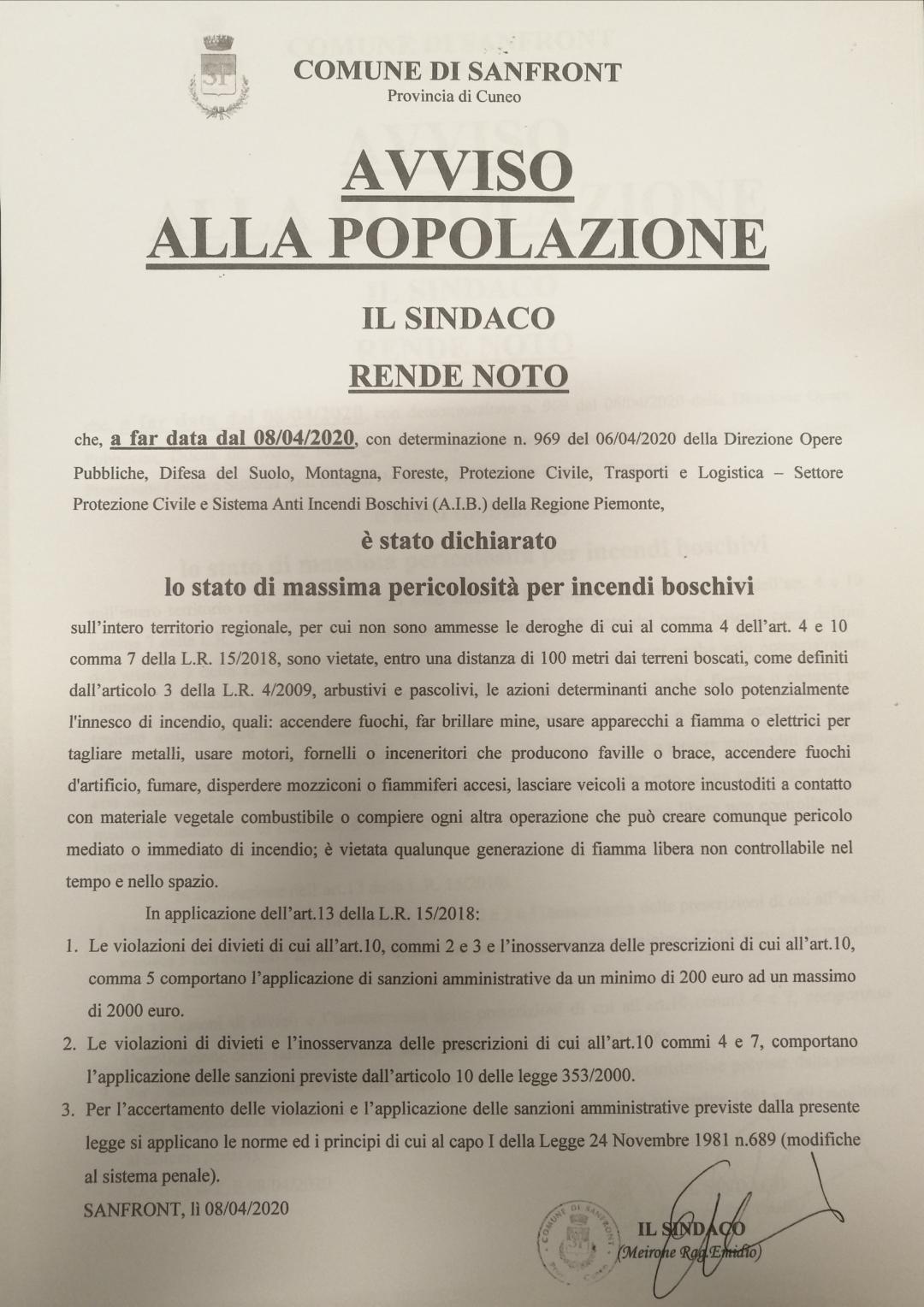 Il sindaco rende noto che a far data dal 08\04\2020, con determinazione n.969 del 06\04\2020 della Direzione Opere Pubbliche, Difesa del Suolo, Montagna, Foreste, Protezione Civile, Trasporti e Logistica - Settore Protezione Civile e Sistema Anti Incendi Boschivi (A.I.B.) della Regione Piemonte,