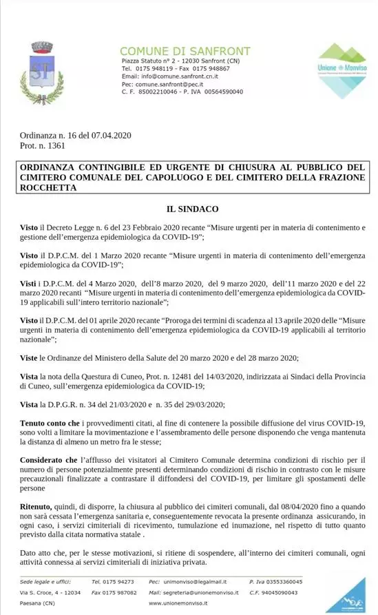 Si allega alla presente comunicazione l'Ordinanza contingibile ed urgente di chiusura al pubblico del cimitero comunale del capoluogo e del cimitero della frazione Rocchetta dal giorno 8\04\2020 fino a quando non sarà cessata l'emergenza sanitaria e conseguentemente revocata l'Ordinanza in questione.