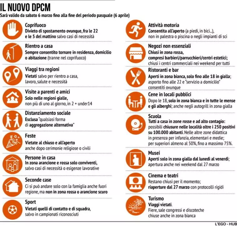 Sarà in vigore a partire da oggi 6 marzo fino al 6 aprile 2021 e conferma, fino al 27 marzo, il divieto di spostarsi tra regioni o province autonome diverse, con l’eccezione degli spostamenti dovuti a motivi di lavoro, salute o necessità.