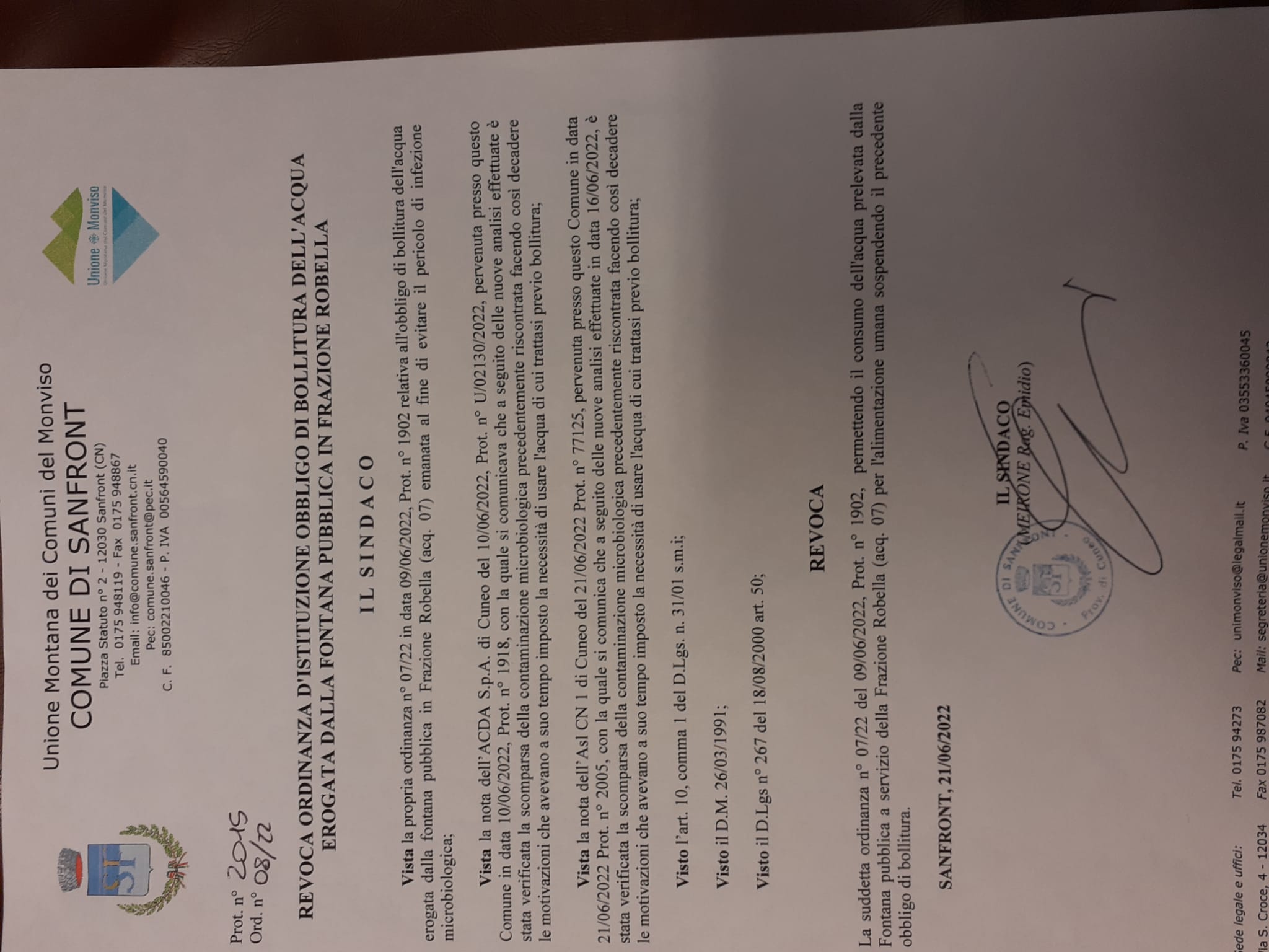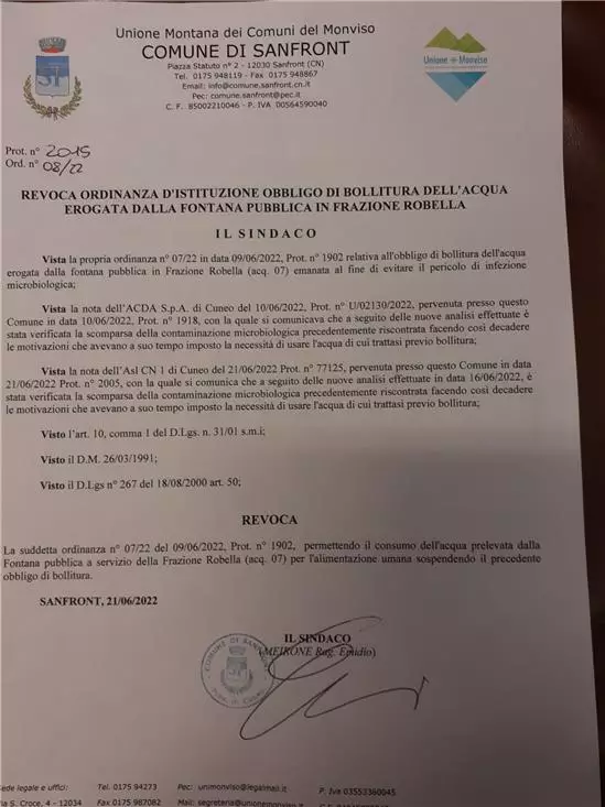 In allegato la REVOCA dell'ordinanza n.07/22 del 9.6.22, prot. n.1902, permettendo dunque il consumo dell'acqua prelevata dalla fontana pubblica a servizio della FRAZIONE ROBELLA (acq. 07) per l'alimentazione umana sospendendo il precedente obbligo di bollitura.