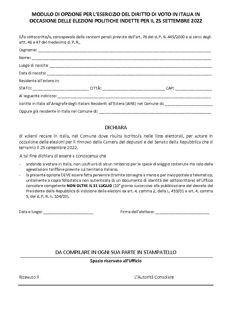 Descrizione Entro il 31 luglio 2022 gli Elettori iscritti all'A.I.R.E. possono optare per esercitare il diritto di voto in Italia utilizzando l'allegato modulo.