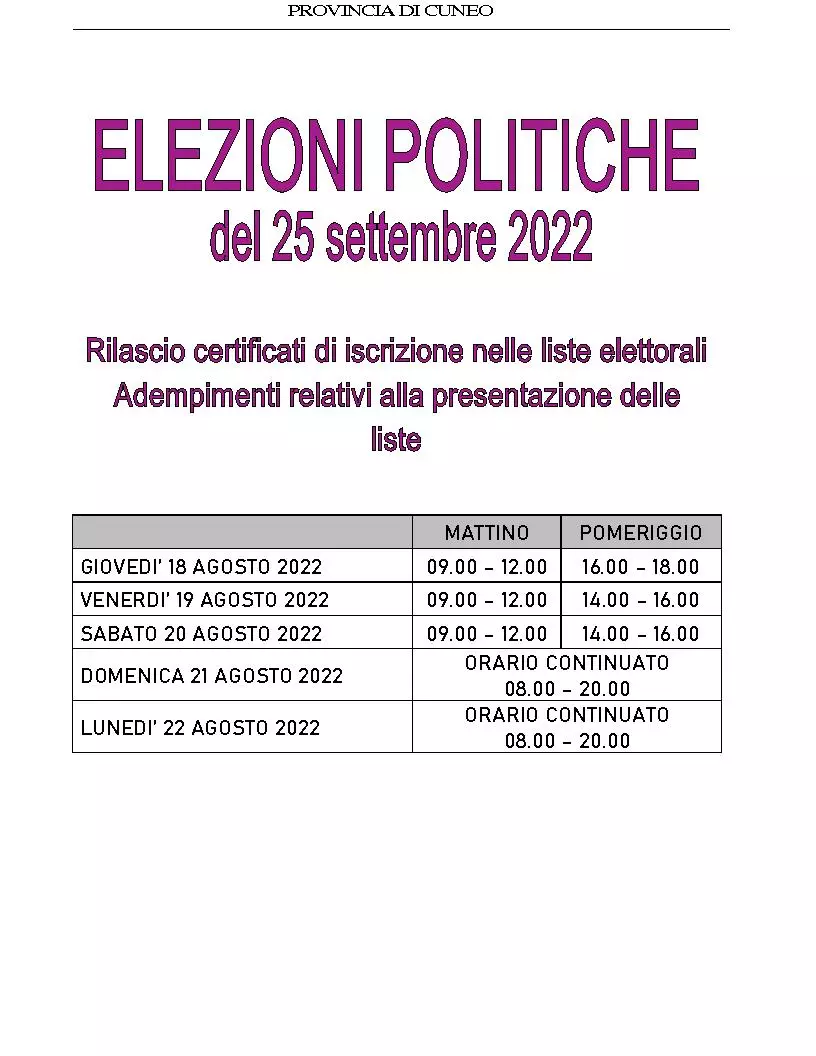 Descrizione Per il solo rilascio dei certificati elettorali, in vista delle prossime Elezioni Politiche del 25 settembre, l'Ufficio Elettorale ha organizzato un orario con aperture straordinarie come da allegato.